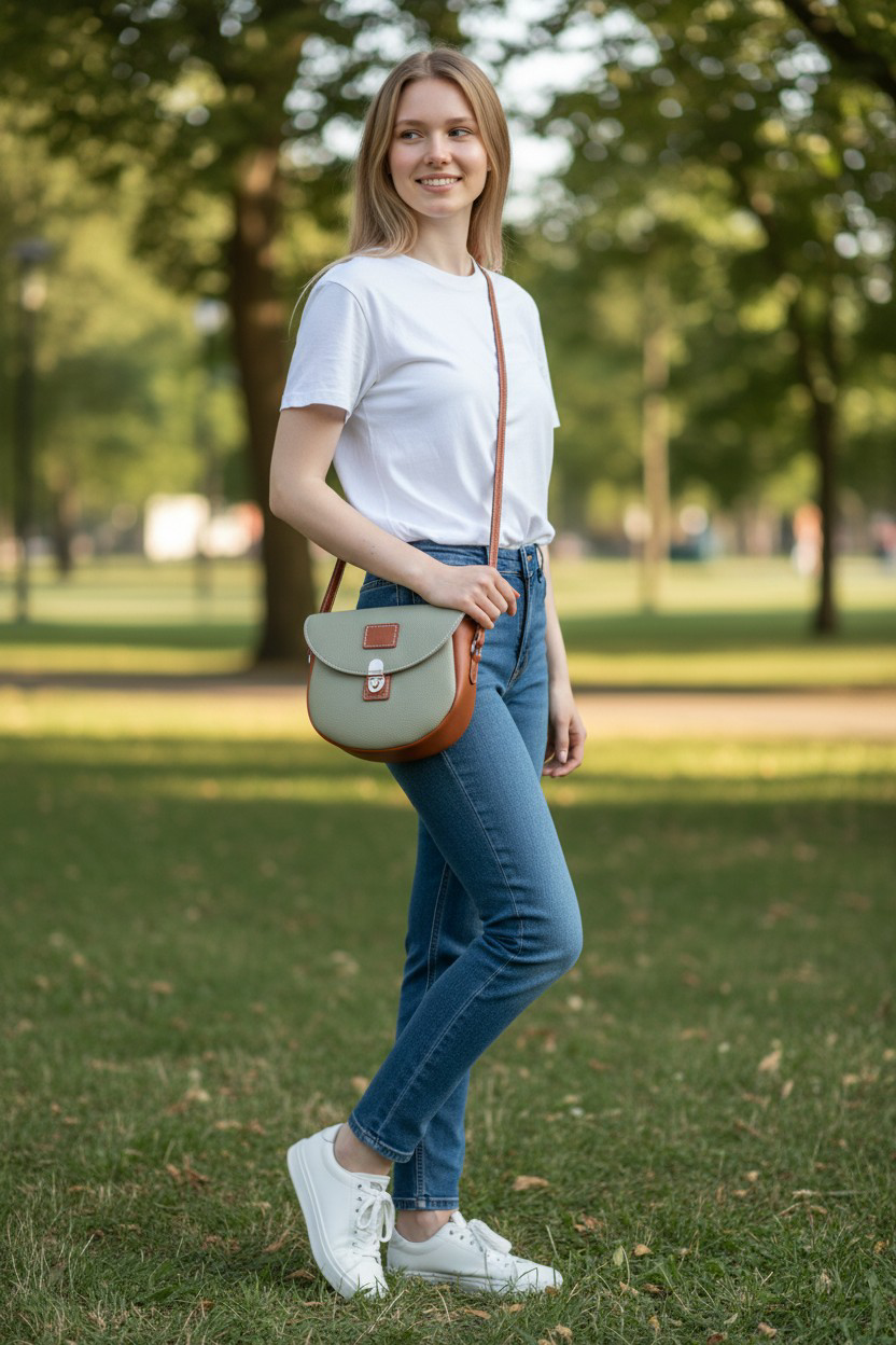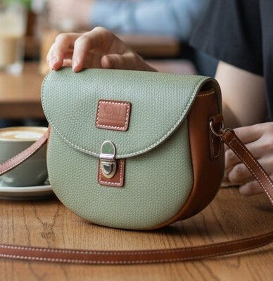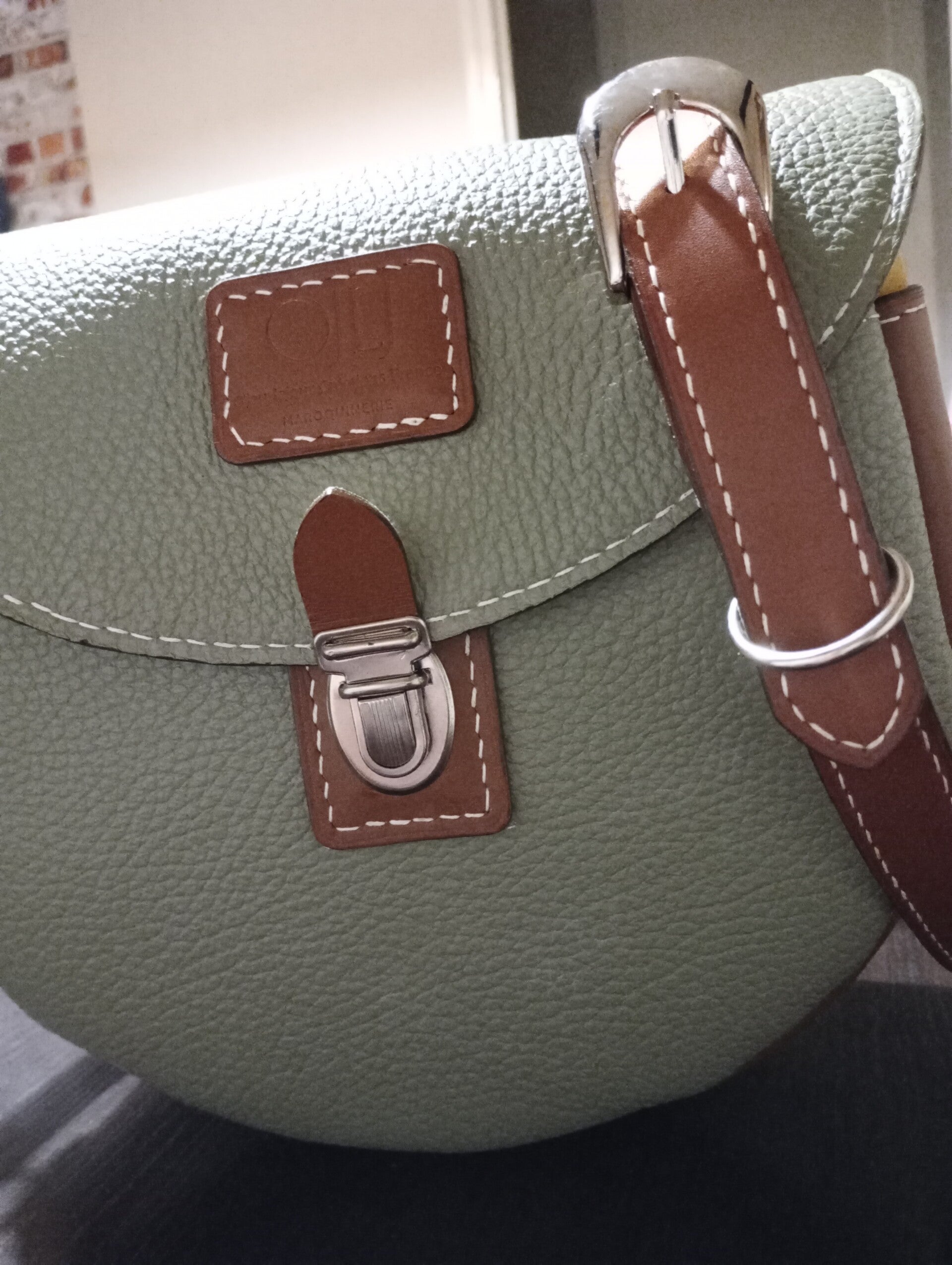 Sac en cuir entièrement cousu à la main avec du fil de lin. Cuir utilise vachette grainé couleur vert amande cousu avec fil blanc. Cuir vachette lisse marron clair cousu avec fil blanc. Toute la bouclerie est de couleur argentée. Fermer avec un fermoir appeler "tuck". Intérieur entièrement doublé textile beige. Sangle réglable et amovible. Dimension hauteur du sac 22 cm, largeur du sac 22 cm, profondeur 8 cm.