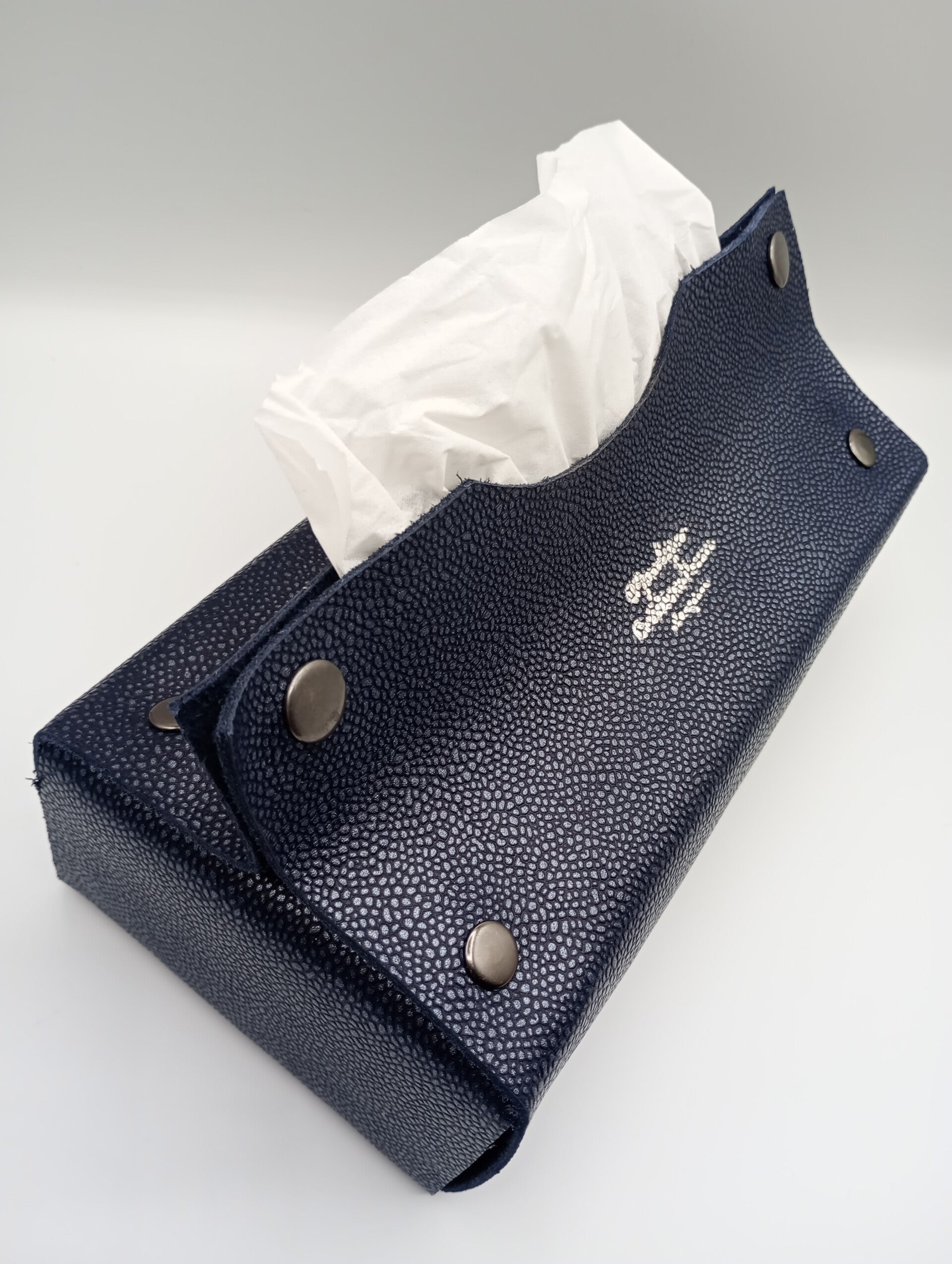 Etui boite mouchoirs jetables, en cuir vachette grainé de couleur bleu marine. il convient pour des boites mouchoirs dont les mesures; largeur 23cm,profondeur 12cm et hauteur 7cm.
